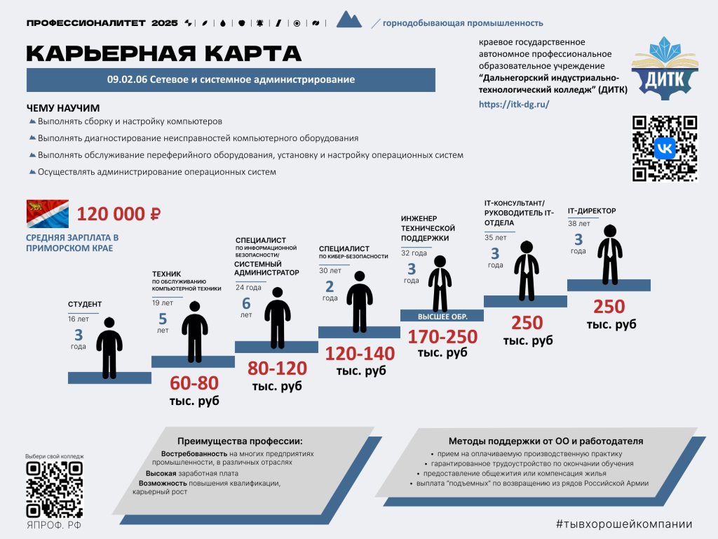 Обучение по данной специальности направлено на подготовку квалифицированных специалистов, способных настраивать, обслуживать и защищать IT-инфраструктуру, обеспечивая её надежность и безопасность.