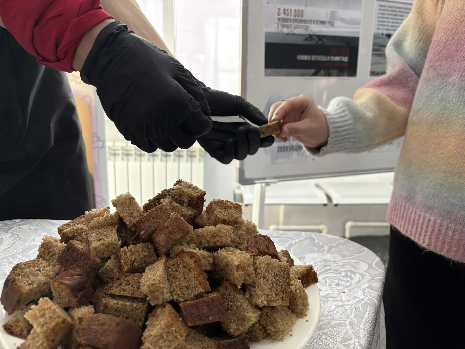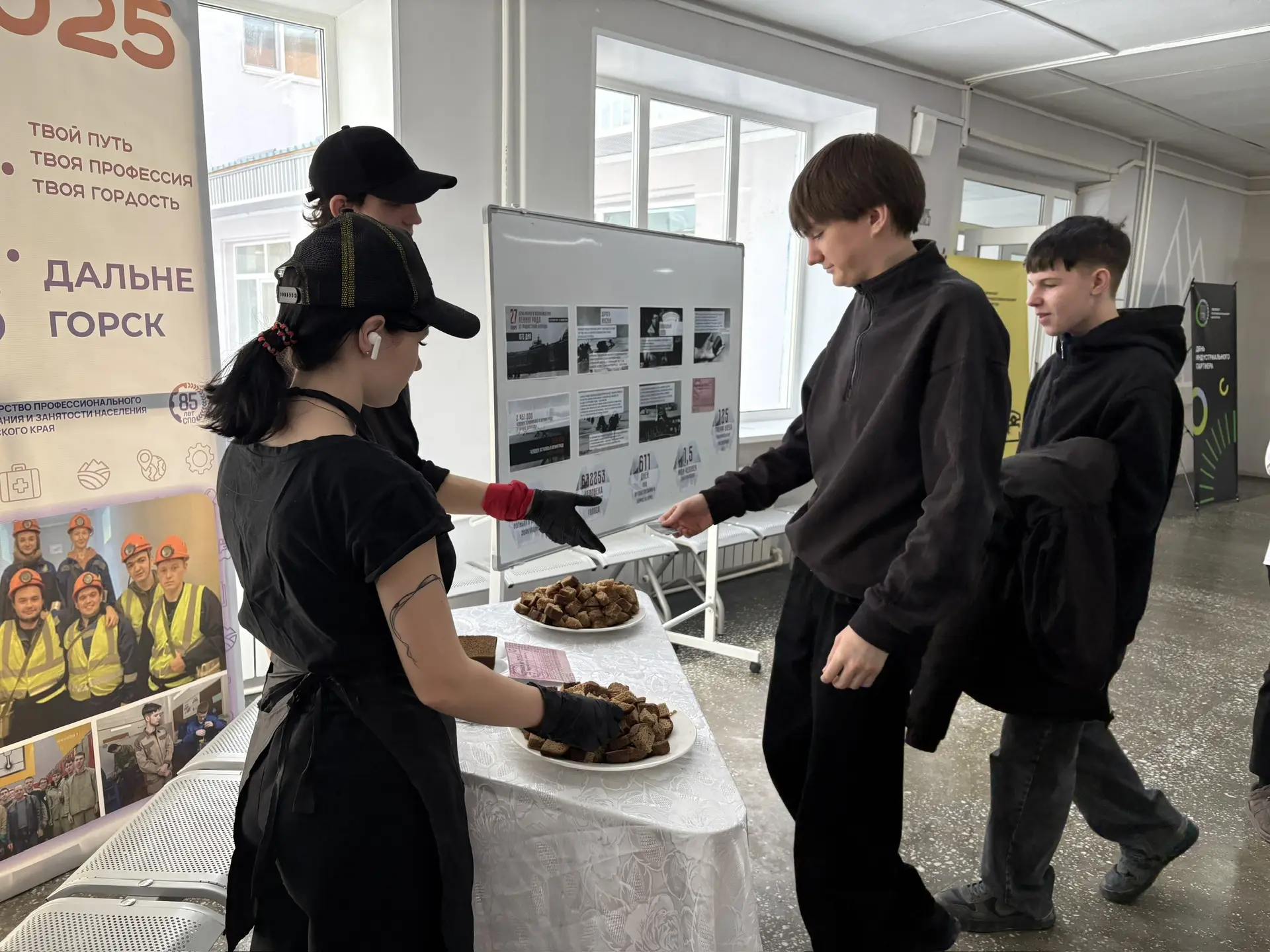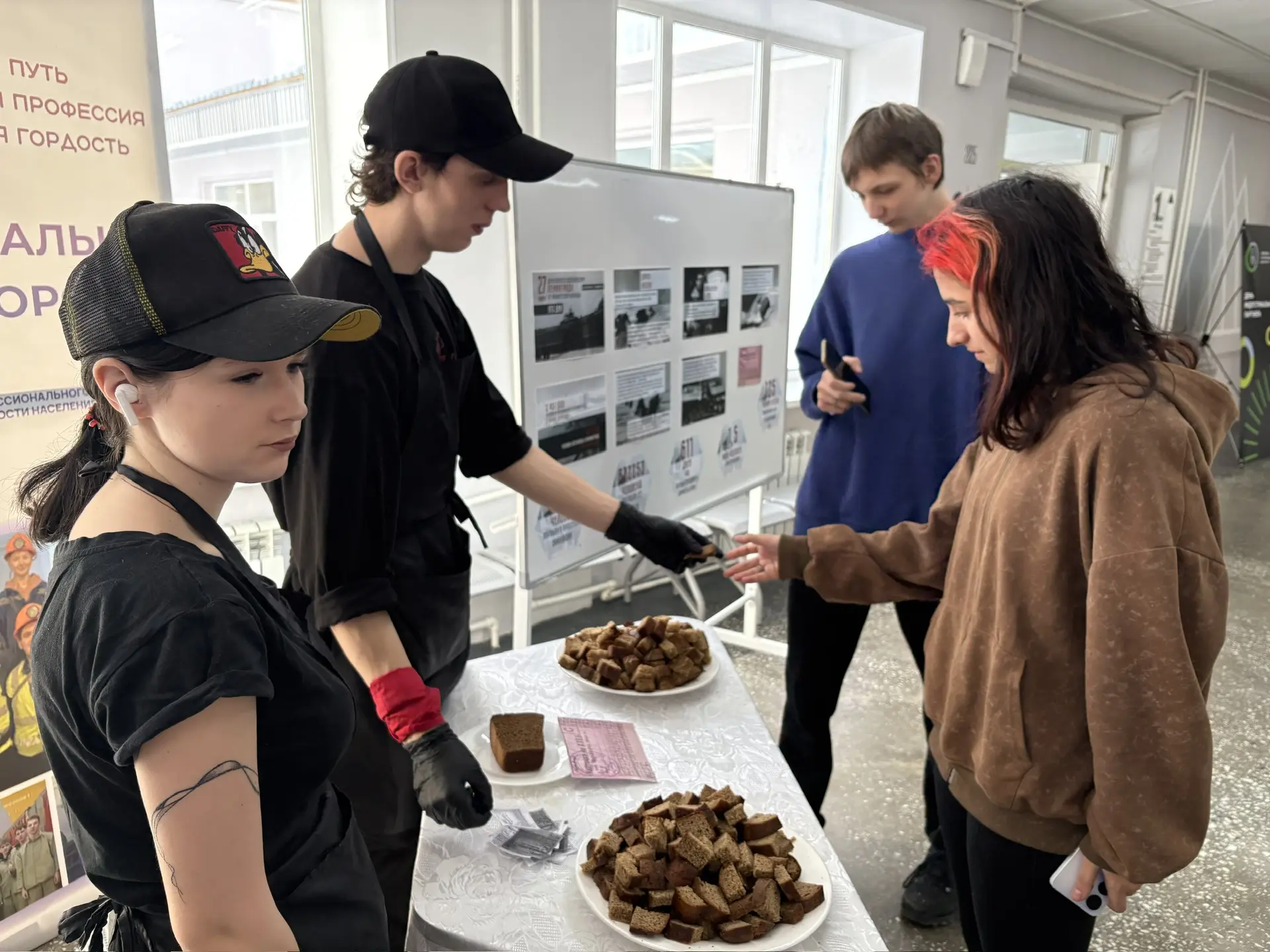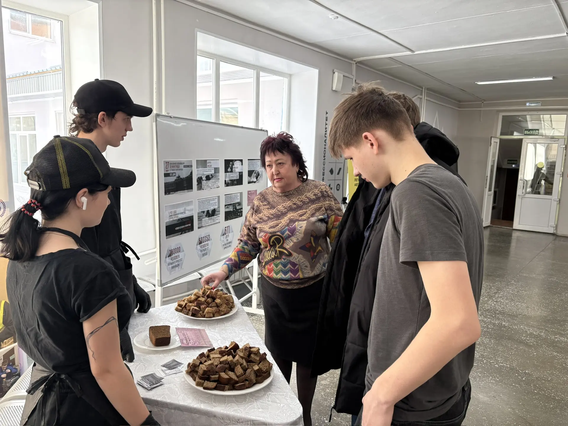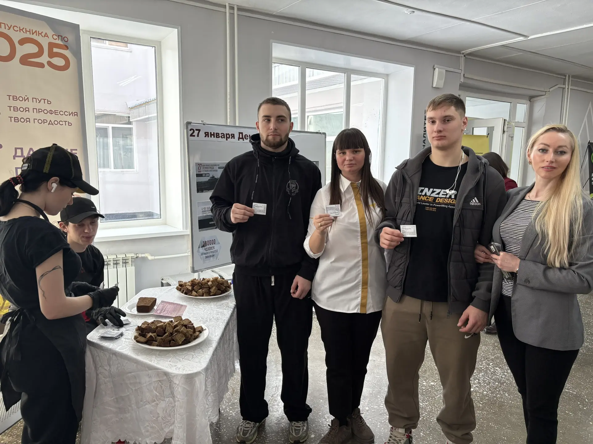 Во время перемен в холле колледжа студенты КГА ПОУ «ДИТК» получали хлеб по карточкам, как это было в годы блокады. Этот небольшой кусочек стал символом стойкости, несгибаемой воли и надежды людей, переживших одно из самых страшных испытаний XX века.