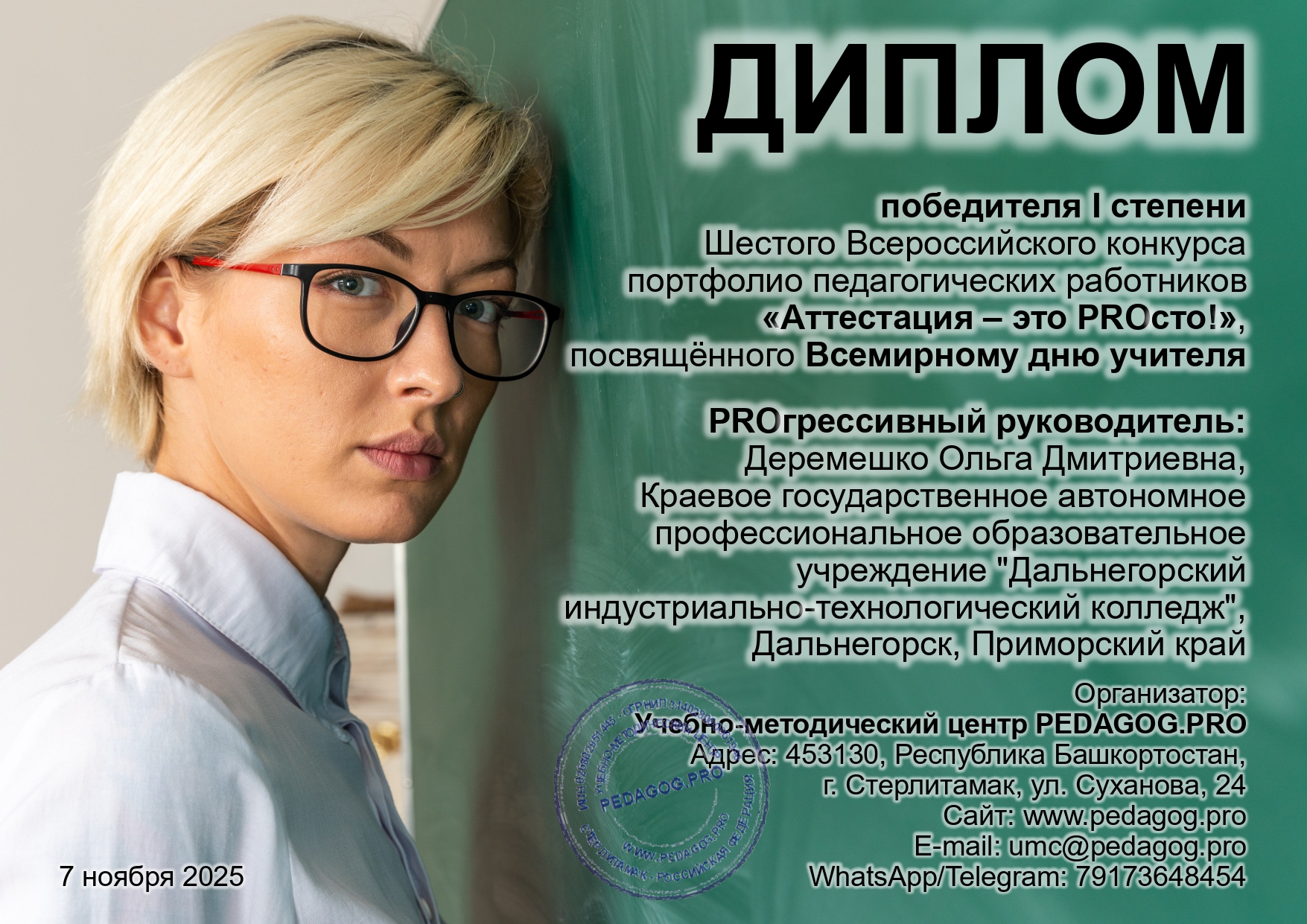 В номинации «PROгрессивный руководитель» наш колледж достойно представила старший методист Ольга Дмитриевна Деремешко, которая продемонстрировала высокий профессионализм, инновационный подход и творческое отношение к работе, заняв 1 место по итогам конкурса!