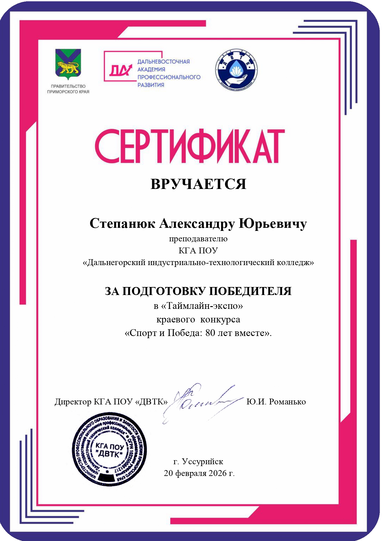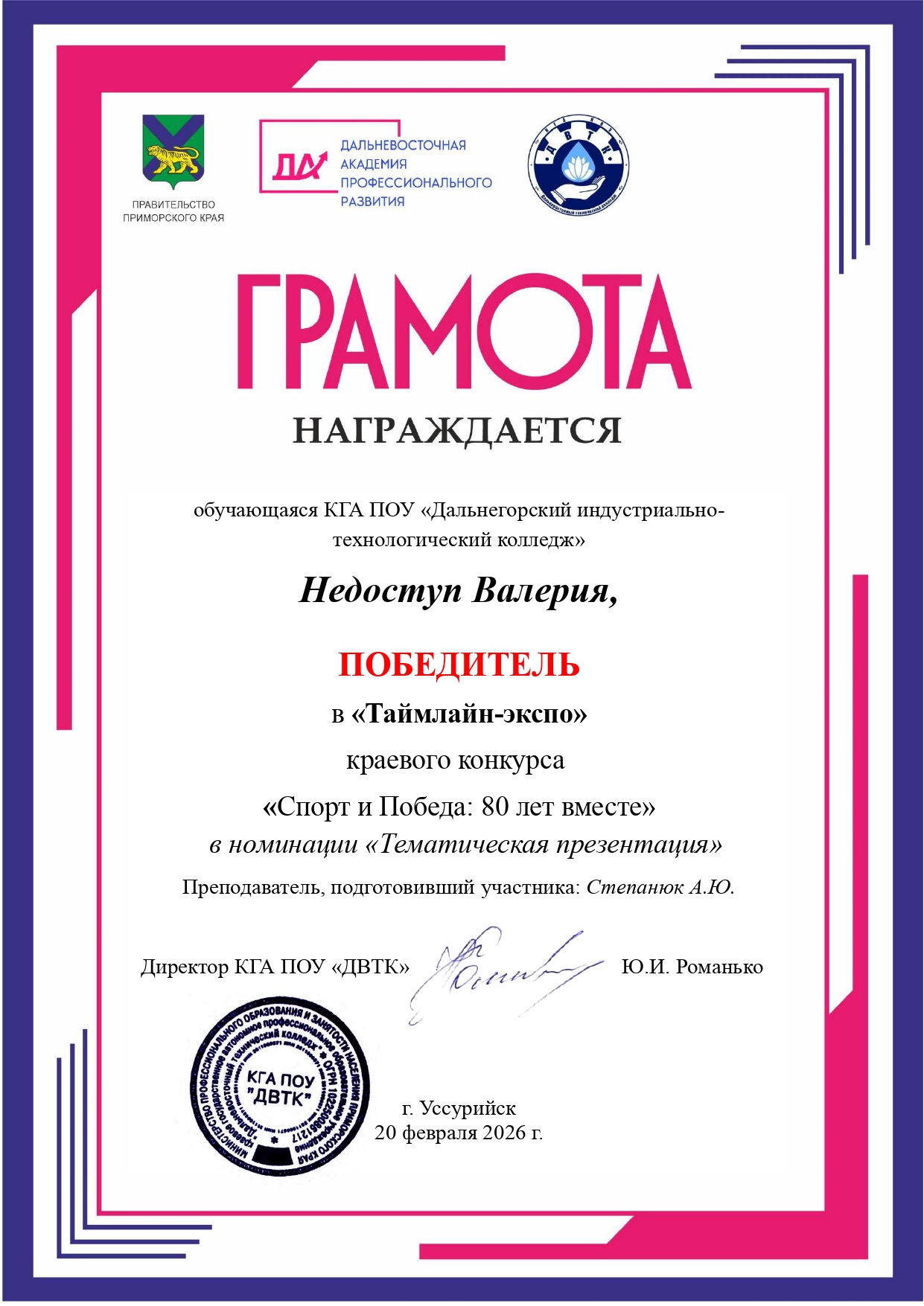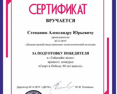 20 февраля 2026 года подведены итоги конкурса. Победителем в номинации «Тематическая презентация» признана Недоступ Валерия, обучающаяся КГА ПОУ «Дальнегорский индустриально-технологический колледж». Подготовку победителя осуществлял преподаватель Степанюк Александр Юрьевич.