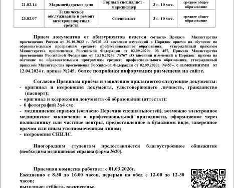 Всю подробную информацию о перечне профессий и специальностей, а также об условиях приёма ищите в наших информационных карточках 👆
