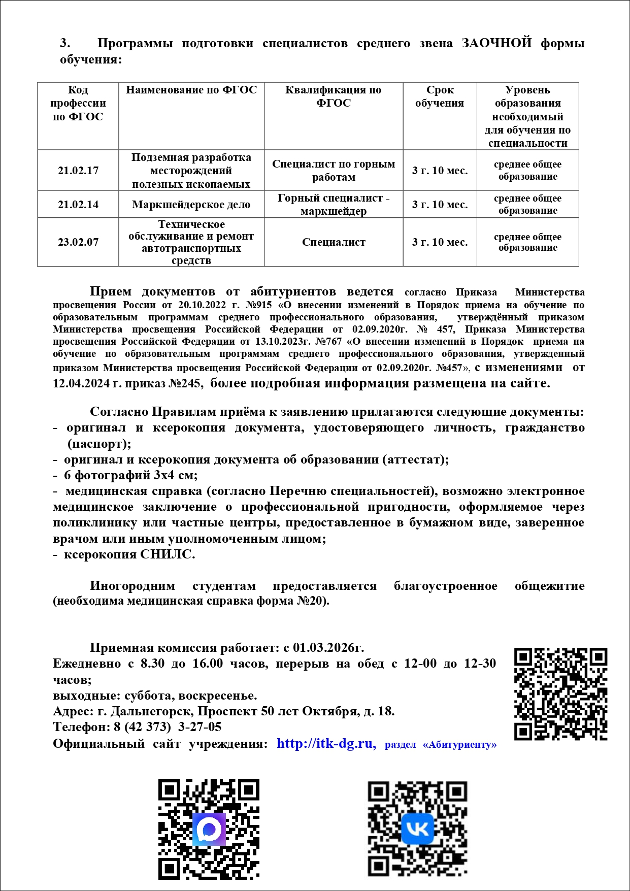 Дальнегорский индустриально-технологический колледж распахивает свои двери для будущих абитуриентов 2026-2027 учебного года. 🤝 Уже с 1 марта 2026 года мы ждем выпускников прошлых лет, а с июня — всех выпускников 2026 года. Сделайте первый шаг к своей будущей профессии вместе с нами! 🚀