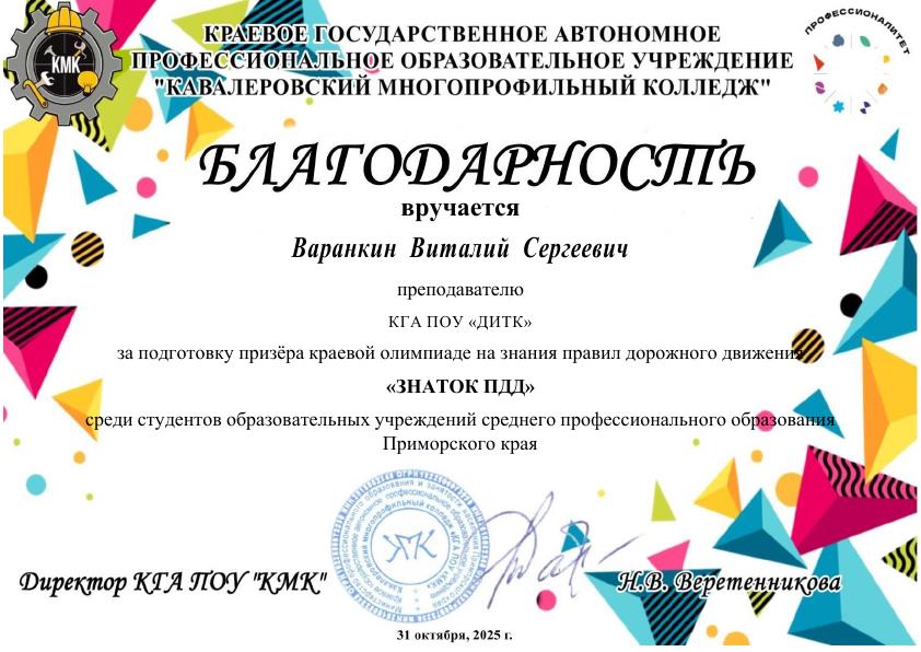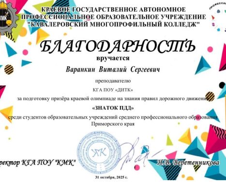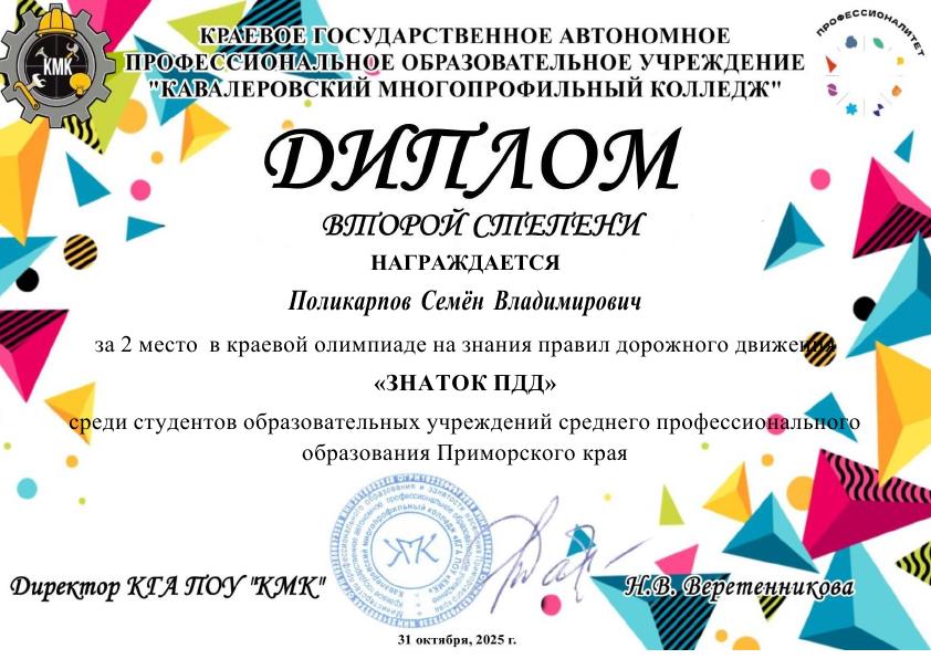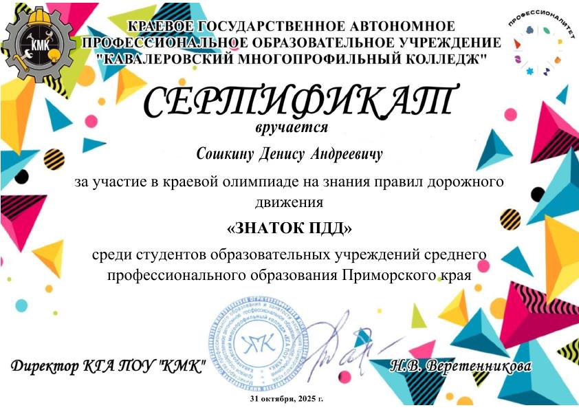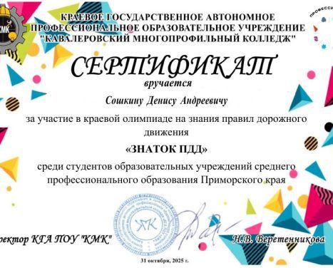 Олимпиада на знание Правил дорожного движения «ЗНАТОК ПДД» среди студентов образовательных учреждений СПО Приморского края, прошла в соответствии с планом Регионального учебно-методического объединения «Наземный транспорт и логистика, автомобильный транспорт». Организатор олимпиады — Кавалеровский многопрофильный колледж.