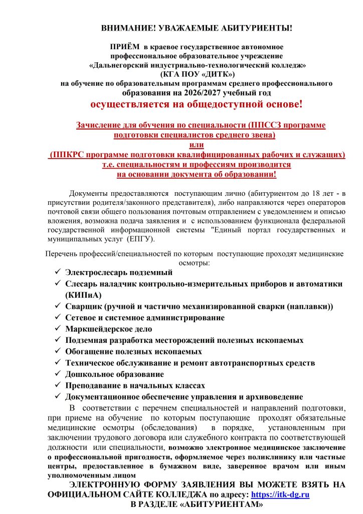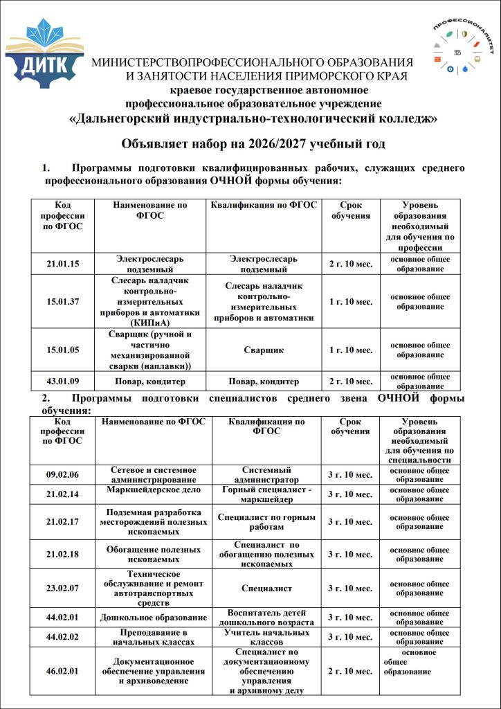 Министерством профессионального образования и занятости населения Приморского края определены контрольные цифры приёма в КГА ПОУ «ДИТК» на 2026/2027 учебный год – 310 человек