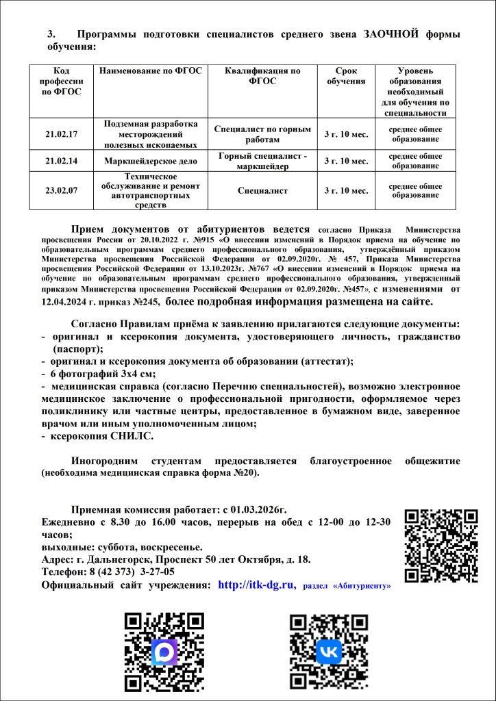 Приемная комиссия работает ежедневно с 8-30 до 16-00 перерыв на обед с 12-00 до 12-30 выходные: суббота, воскресенье по адресу: г. Дальнегорск, проспект 50 лет Октября, д. 18 тел. 8 (42 373) 3-27-05 сайт учреждения: http://itk-dg.ru заместитель директора по воспитательной и социальной работе Ильина Ольга Борисовна тел. 8 (42 373) 3-27-05 заместитель директора по учебно-производственной работе Трофимова Дилноза Файзуллаевна тел. 8 (42 373) 3-27-05 Заместитель начальника отдела профессионального образования и науки министерства профессионального образования и занятости населения Приморского края Баева Лариса Владимировна тел. 8 (423) 2-400-317